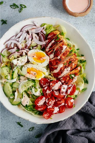A fresh chicken with lettuce, cucumber, tomatoes, onions, eggs, and spicy mayo dressing for a flavorful taste. (Organic chicken - no drugs, antibiotics, hormones, or GMOs).
